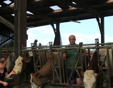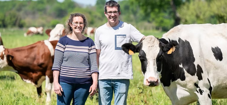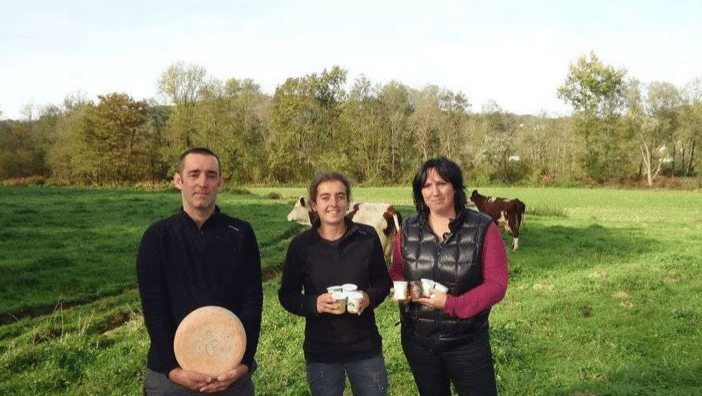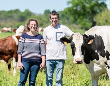 David gère l'élevage de 50 vaches Montbéliardes nourries à l'herbe, aux fourrages de l'exploitation et à des protéines végétales sans OGM, tandis que Cécile transforme le lait depuis 2009 en produits fermiers de qualité.