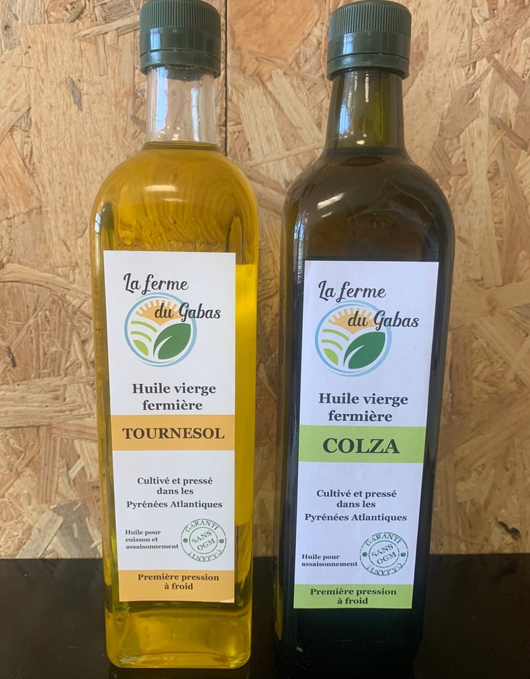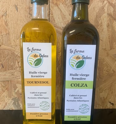 Ferme du Gabas Espechède : Huiles vierges tournesol et colza pressées à froid en Béarn (Pyrénées-Atlantiques), cultivées et embouteillées directement à la ferme près de Pau pour un goût pur et authentique du terroir.