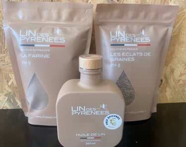 Pionniers de la filière lin oléagineux bio cultivé localement sans pesticides ni irrigation, ils transforment artisanalement la graine en produits santé premium : huile de lin bio de béarn est pressée à froid(oméga-3 essentiels, goût noiseté subtil), farine sans gluten idéale pour pains et pâtisseries, graines décortiquées et éclats croquants riches en fibres.